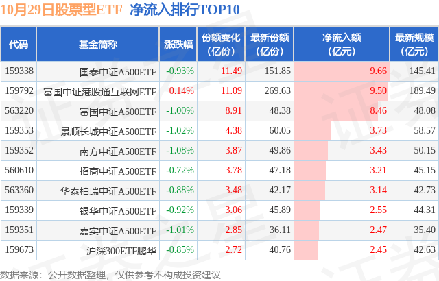 当日有112只股票型ETF基金出现资金净流入,其中净流入排首位的是国泰中证A500ETF,份额增加了11.49亿份,净流入额为9.66亿元。