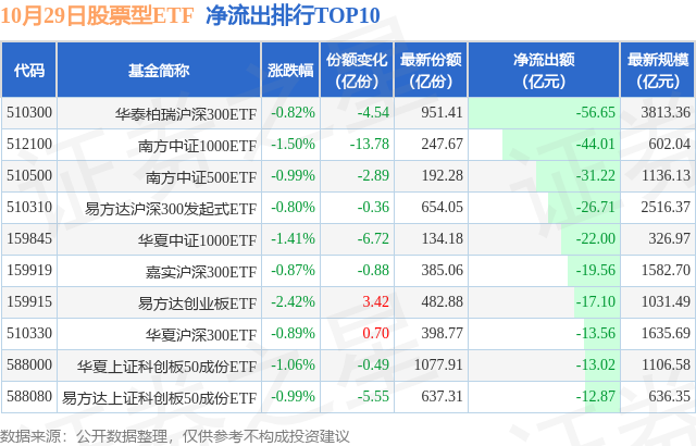 当日有741只股票型ETF基金出现资金净流出,其中净流出排首位的是华泰柏瑞沪深300ETF,份额减少了4.54亿份,净流出额为56.65亿元。