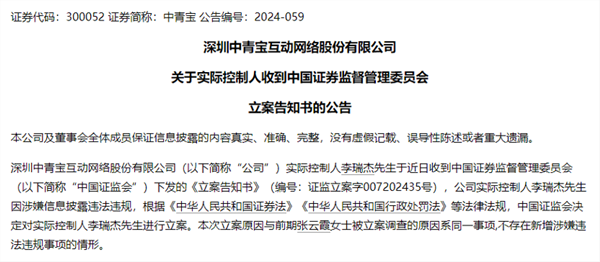 昔日元宇宙第一股中青宝昨日晚间公告称,公司实际控制人李瑞杰收到中国证监会下发的《立案告知书》,因涉嫌信息披露违法违规,中国证监会决定对李瑞杰进行立案。本次立案原因与前期张云霞被立案调查的原因系同一事项,不存在新增涉嫌违法违规事项的情形。