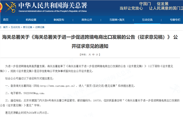 日前,海关总署发布《海关总署关于进一步促进跨境电商出口发展的公告》公开征求意见的通知。