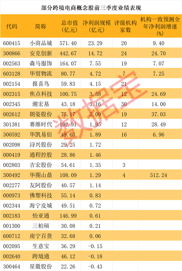 从业绩看,18股今年前三季度净利润过亿元,小商品城、安克创新、森马服饰净利润高于5亿元。小商品城实现营收106.13亿元,同比增长34.25%;归母净利润23.29亿元,同比增长0.53%。