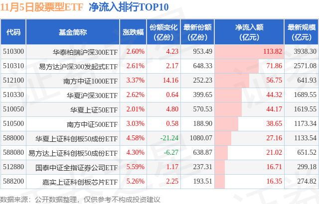 当日有559只股票型ETF基金出现资金净流入,其中净流入排首位的是华泰柏瑞沪深300ETF,份额增加了4.23亿份,净流入额为113.82亿元。