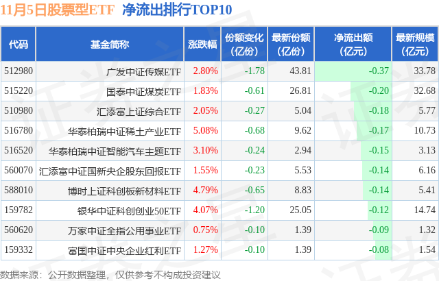 当日有67只股票型ETF基金出现资金净流出,其中净流出排首位的是广发中证传媒ETF,份额减少了1.78亿份,净流出额为3730.52万元。