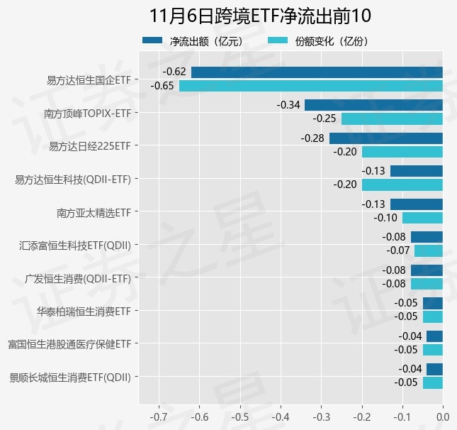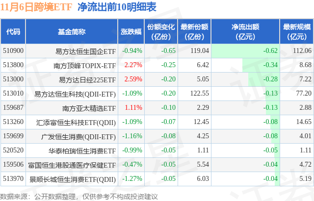 当日有27只跨境ETF基金出现资金净流出,其中净流出排首位的是易方达恒生国企ETF,份额减少了6500.0万份,净流出额为6183.98万元。