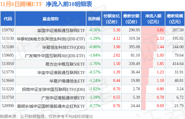 当日有69只跨境ETF基金出现资金净流入,其中净流入排首位的是富国中证港股通互联网ETF,份额增加了5.3亿份,净流入额为3.81亿元。