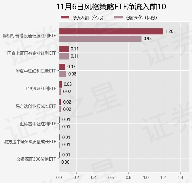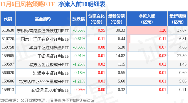 当日有8只风格策略ETF基金出现资金净流入,其中净流入排首位的是摩根标普港股通低波红利ETF,份额增加了9500.0万份,净流入额为1.2亿元。