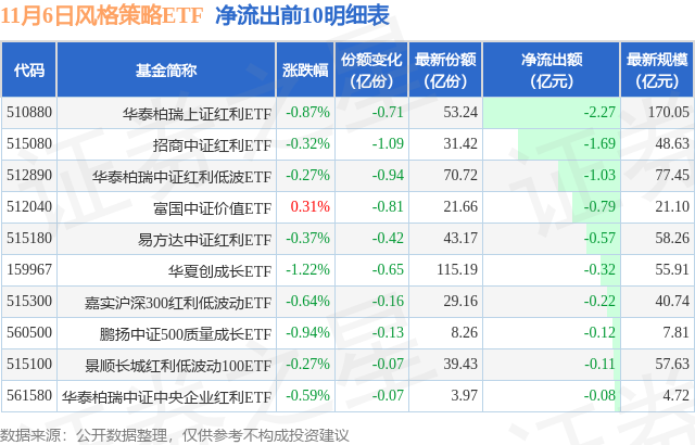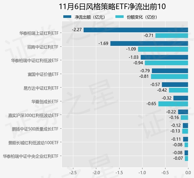 当日有29只风格策略ETF基金出现资金净流出,其中净流出排首位的是华泰柏瑞上证红利ETF,份额减少了7100.0万份,净流出额为2.27亿元。