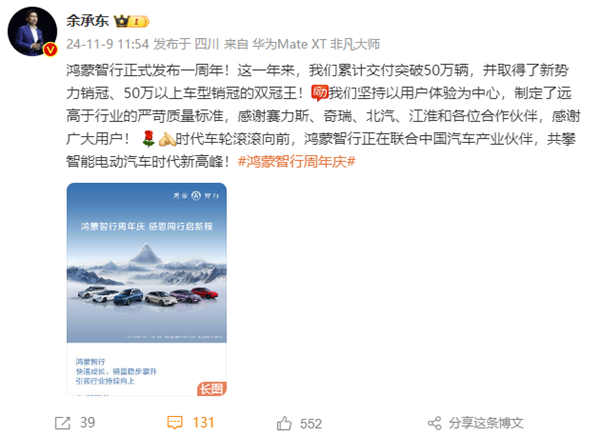 科技苑 财经 余承东:鸿蒙智行正式发布一周年 感谢赛力斯、奇瑞、北汽、江淮和各位合作伙伴 余承东:鸿蒙智行正式发布一周年 感谢赛力斯、奇瑞、北汽、江淮和各位合作伙伴 作者: hao333 发布:2024-11-09 13:22:06 2769阅读 8273评论 华为常务董事、终端BG董事长、智能汽车解决方案BU董事长余承东在微博发文称:“鸿蒙智行正式发布一周年。这一年来,我们累计交付突破50万辆,并取得了新势力销冠、50万元以上车型销冠的双冠王。我们坚持以用户体验为中心,制定了远高于行业的严苛质量标准,感谢赛力斯、奇瑞、北汽、江淮和各位合作伙伴,感谢广大用户!” 本文来自网络,不代表本站立场,转载请注明出处:https: