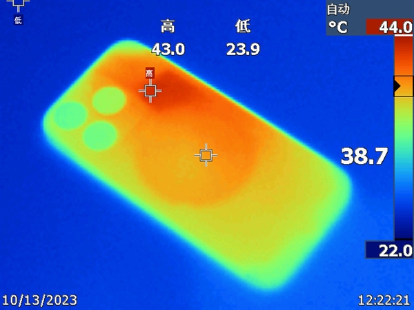玩了王者1小时后,我们用专业的红外热成像仪测试:手机的背板平均温度在38.7度左右,最高处温度为43度,整体而言其实不算太热。在持续玩了半小时后,手机的温度依旧保持在42-44度左右。但手机的电量也从43%降至了19%。