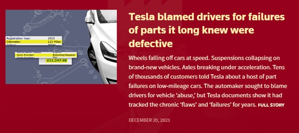 特斯拉掩盖了转向和悬挂部件的危险缺陷;