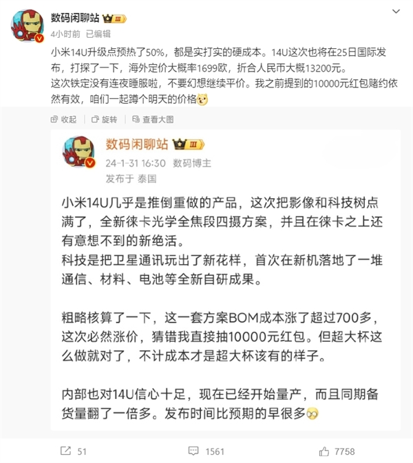 据了解,前代小米13 Ultra的海外起售价为1499欧元,约合人民币11000元,新品价格上涨不少。