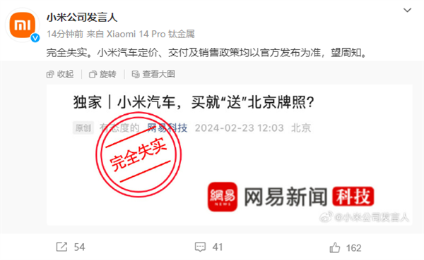 不过,杨学良的没好愿望怕是要落空了,因为就在刚刚,小米公司发言人发布微博,就原报道进行辟谣,称其完全失实,小米汽车定价、交付及销售政策均以官方发布为准,望周知。