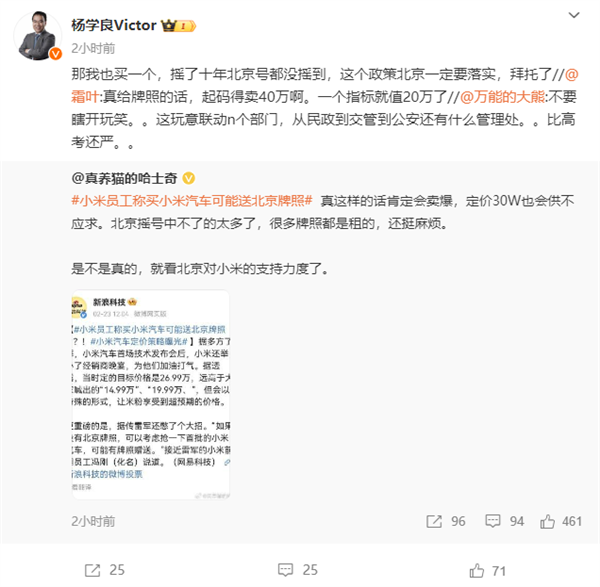 一石激起千层浪,话题#小米员工称买小米汽车可能送北京牌照# 登上微博热搜,吸引了很多圈内圈外人士的关注。
