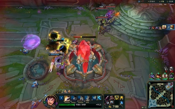 就比如6名角色同时出现在对方门牙塔的时候,游戏帧率甚至在200帧以上,比对线时的帧率还要高。