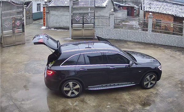 从监控画面看,男子驾驶一台黑的的奔驰GLC返回家中,将车停在了院里的屋檐下面,他的老婆正在打扫院子,见他将车停在了屋檐下后,提醒他上面的冰块可能会掉下来砸住车。