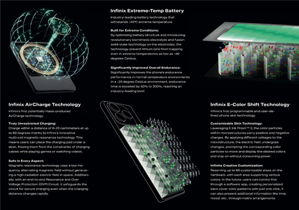 此外,传音还展示了Infinix AirCharge,一项基于磁共振的无线充电技术,支持0-20cm距离充电,还有Infinix Extreme-Temp Battery技术,行业首款能够支持在零下40摄氏度等极端低温环境下充电的电池技术。