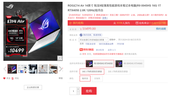 其中,ROG幻14 Air起步版配备锐龙9 8945HS、RTX 4050、16GB LPDDR5-6400、1TB PCIe 4.0 SSD,铂月白配色首发价10499元,升级到RTX 4060、32GB 12499元并可选日蚀灰。