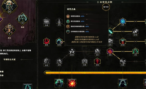 在死灵法师天赋树下,你必须指出军队崛起和诅咒之血,这两个都需要8点,护盾崩溃需要6点,这是天赋树左侧的重要天赋。