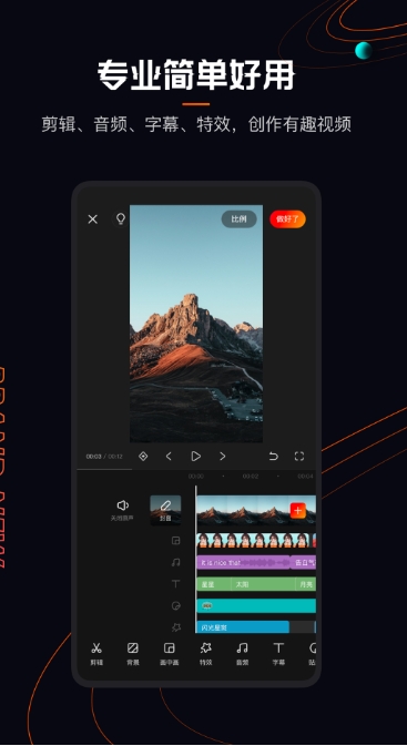 点击“调整”可以美化视频、添加滤镜特效等。点击工具中的“音效”为视频添加音乐,选择“字幕”为视频添加字幕和文字贴纸;