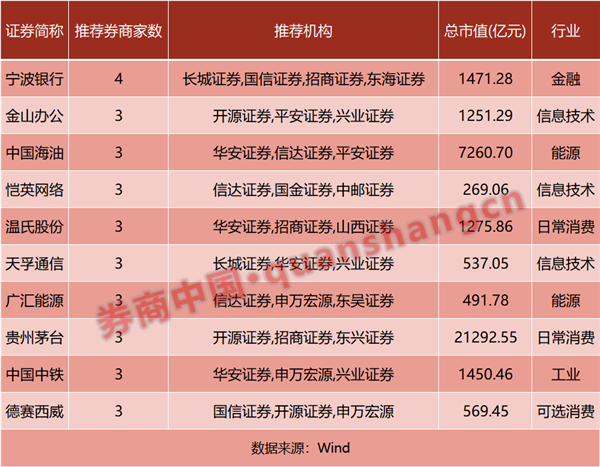 3月份热门金股方面,截至目前,共有10只金股被不少于3家券商选为当月金股,分布在信息技术、金融、能源、消费等行业。