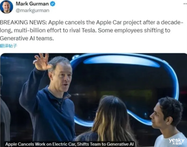 苹果爆料记者马克古尔曼最新表示,在与特斯拉进行了长达十年、数十亿美元的竞争后,苹果取消了苹果汽车项目。一些员工转向GenerativeAl团队。