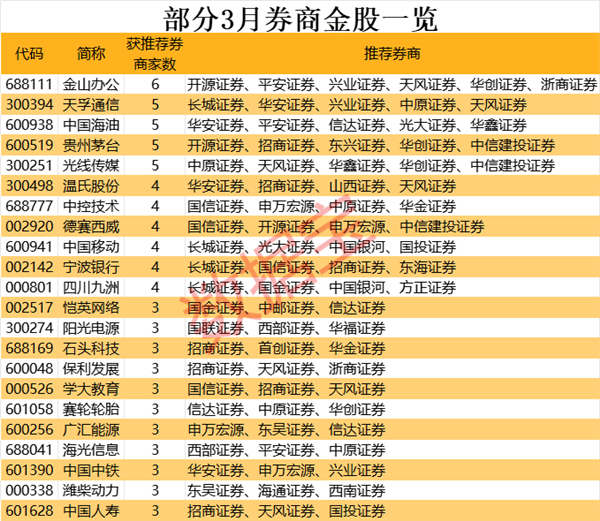 个股来看,获机构推荐次数最多的是金山办公,有6家券商推荐;天孚通信、中国海油、贵州茅台、光线传媒均获5家券商的推荐。