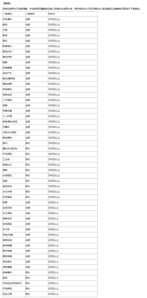 部分类目商品单品满额(59元以上或0元)须支持单品包邮;