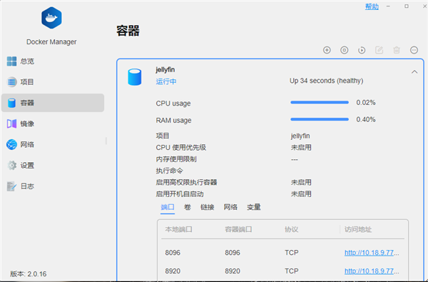 提供了丰富的容器管理功能,包括容器的日志查看、资源监控、端口映射、环境变量设置等。