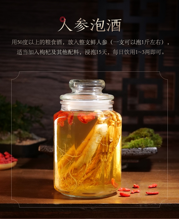 食用方法:鲜人参鸡汤、人参泡酒等。