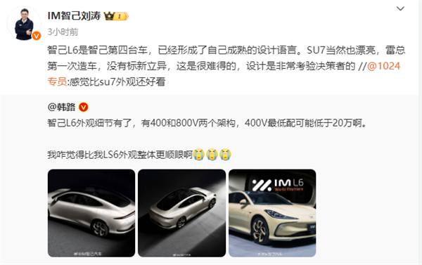 刘涛转发该评论并表示,智己L6是智己第四台车,已经形成了自己成熟的设计语言。