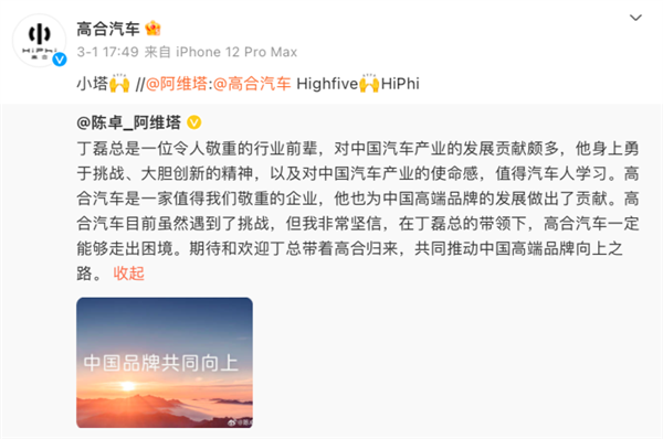 虽然长安方面称是不实消息,但双方的互动还算友好,长安旗下的阿维塔日前也曾向高合和丁磊致意,阿维塔总裁陈卓在社交媒体发文称期待和欢迎丁总带着高合归来,阿维塔和高合都转发了这条消息互动。