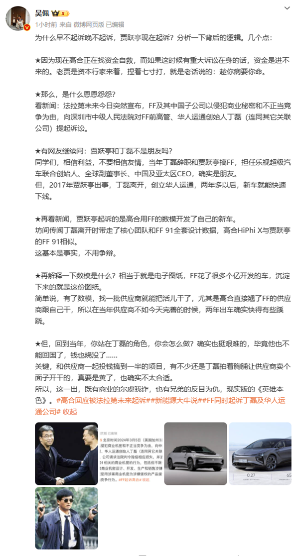 对此,汽车博主吴佩发文分析了这背后的逻辑,因为现在高合正在找资金自救,而如果这时候有重大诉讼在身的话,资金是进不来的。