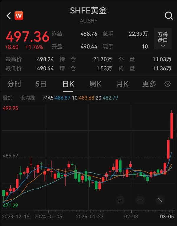 而在黄金期货方面,沪金主力期货进入三月以来,连续四日上涨。截至3月5日收盘,沪金上涨1.76%,报收497.36元/克,同样创下历史新高。