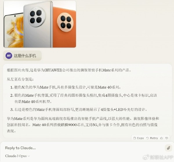 据了解,近日有国内媒体对Claude 3系列中最强的Claude 3 Opus进行了实测,并与GPT-4进行了对比。结果在图片识别识别环节,Claude 3 Opus却将华为Mate50手机错认成了Mate40。