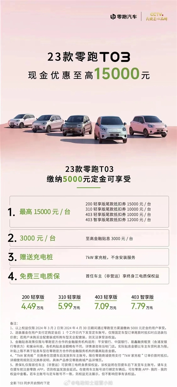全新零跑T03上市之后,2023款零跑T03车型也迎来现金优惠活动,起售价降至4.49万元。