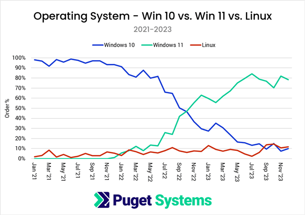 3月6日消息,北美OEM厂商Puget Systems公布了2023年度硬件调查报告,涵盖CPU处理器、GPU显卡、存储、操作系统等不同维度。