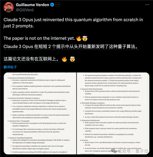 另一位搞量子计算的大哥,论文还没发布呢,Claude 3没看论文就在两个提示词之内把他的算法给重新发明了出来。