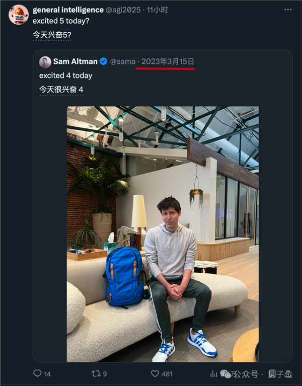 还有人翻出奥特曼在去年3月15日发布GPT-4之前晒自拍玩谐音梗(4英文four发音接近for)的贴子,花式催更。