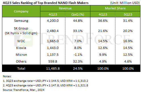 3月7日消息,根据集邦咨询的统计,2023年第四季度全球NAND闪存市场总营收达114.9亿美元,环比大涨24.5%。