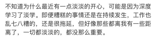 所以不得不说,淡学某种程度上是种保全自己的智慧,是种不在不值得的人和事上拧巴内耗的本事。