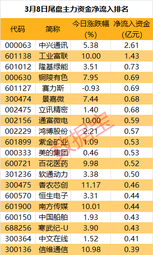 从个股看,7股尾盘主力资金净流入超0.65亿元。中兴通讯尾盘获抢筹2.61亿元,居首。