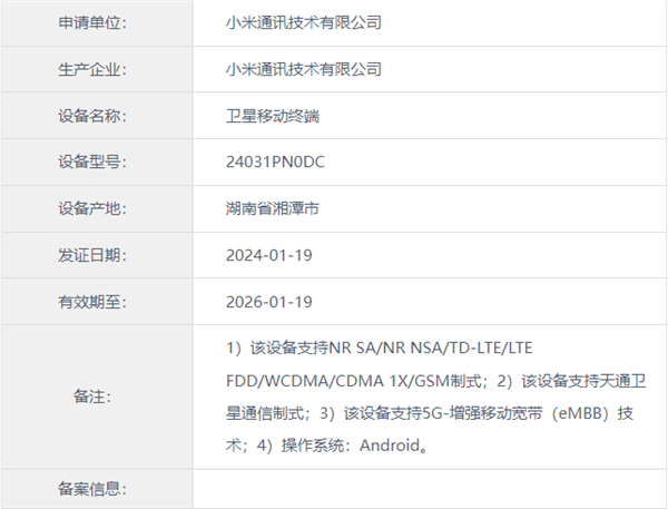 此前还曾有一款小米Civi 4入网,当时入网信息的设备名称为卫星移动终端,也就是支持卫星通信,将作为高配版本推出。