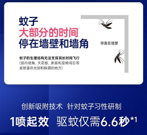 拜耳灭蚊喷雾一次喷射后(约可持续 24 小时),挥发物迅速扩散,附着在墙壁、天花板、地板等物体表面,蚊子停落触碰后,击倒死亡。
