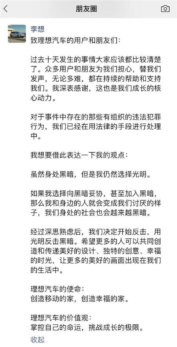 李想在朋友圈的发文很长,总结下来有三个核心信息: