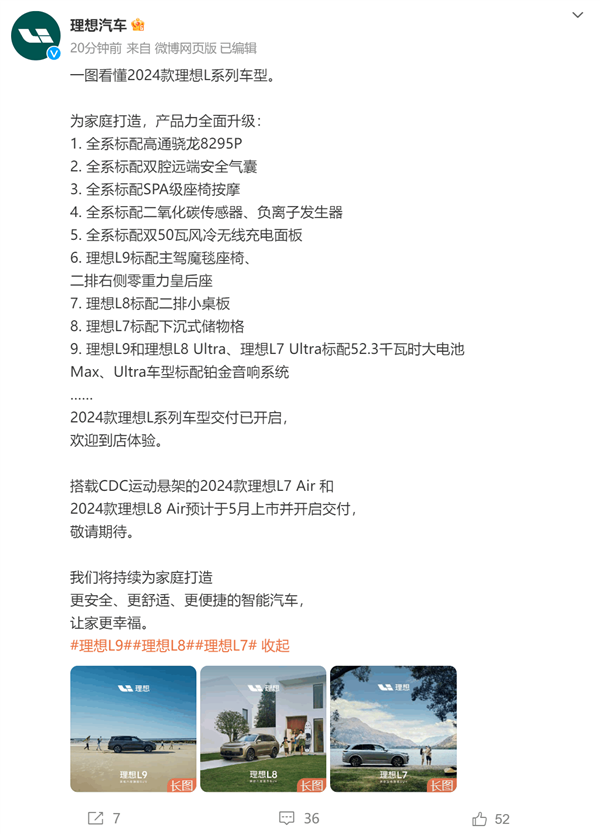 3月12日消息,理想汽车宣布,对L系列产品线进行调整。