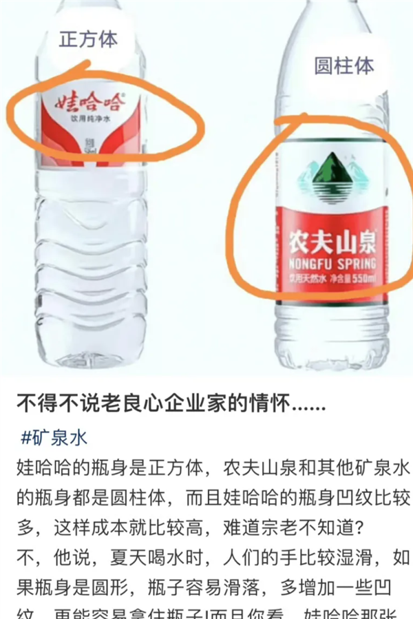 有人说,娃哈哈的瓶身是正方体,而且凹纹很多,这样虽然增加了成本但是夏天能容易拿住瓶子。