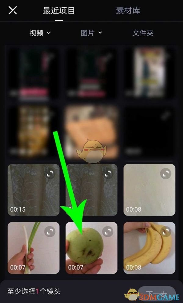 2.打开最近的项目,点击“素材“,然后点击“下一步“。