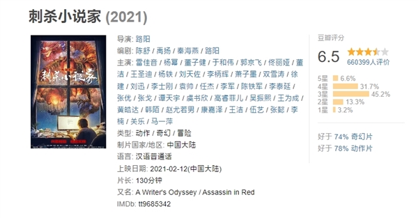 《刺杀小说家》第一部目前的豆瓣评分为6.5分,整体并不算高,主要是剧情方面有些欠缺,但在特效方面却获得了几乎一致的好评,被认为是国产天花板之一。