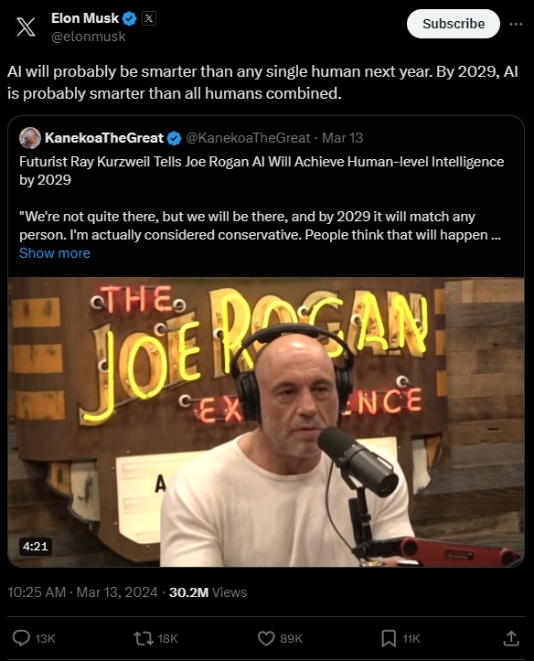 3月14日消息,日前,特斯拉CEO马斯克在社交平台X上评论了乔罗根有关AI(人工智能)的播客视频。
