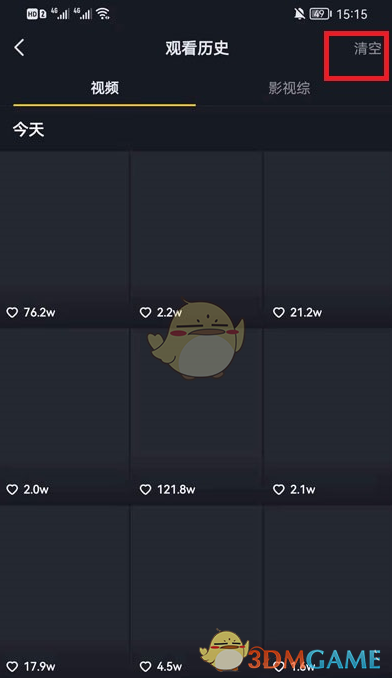 3.进入观看历史界面后,点击右上角的【清除】,删除所有浏览过的视频。